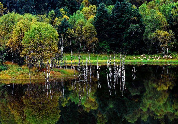 属都湖是一个充满了诗意的地方。春夏季节百花盛开,湖畔四周一片片杜鹃花丛映红整个湖面,各种野花繁星似地贴着地面开放着。湖岸边,那绿色牧场炊烟袅袅,牛铃声声,充满妩媚与柔情,自然而含蓄。秋冬季节更令人心醉,那一片片白桦林满目金黄,于是,红的、金黄的、白的、翠绿的……交相辉映;白色的云朵映衬着淡淡晨雾,在碧蓝如洗的湖心中,构成一幅幅平静而富有诗意的画面。