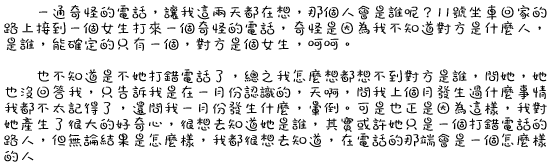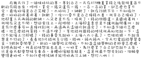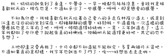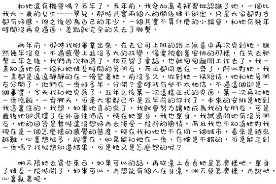 昨天,没想到我真的会这么做。在公车上和一个女生搭讪,呵呵。第一次敢这样,之前在火车上试过好多次,不过那个不一样啊,坐火
