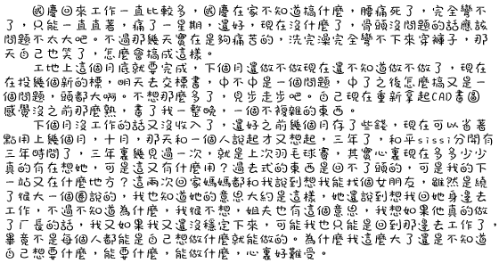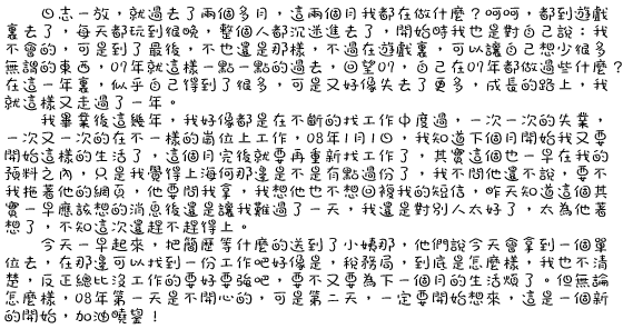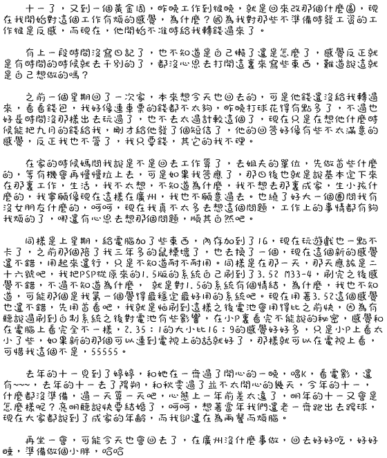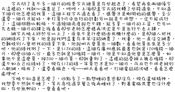 这段时间很多事情都不太如意,工作,生活。过完年后,每个月只有几百块钱的收入,连生活都成问题,现在在找其它的工作了,不过不知道结果怎么样,如果可以,这边我就不再去了,上海何老是觉得我不会走,会让他就这么绑着,这次他算错了,与其现在这样大家都不开心的合作,还不如算了,结束吧,他再找个他觉得好的人,我也去找一份至少能让我生活过得好一些人工作,大家都不要再这样牵着大家了。本来是想和他再谈谈的,可是想想,就算谈了,结果也还是一样。呵,没想到正在写的时候,他就给我打电话了,总体意思是想我干下去,也像我上面说的,他没想到我会走。忽然间这样,他一直觉得几百一个月也能把我留住,可是他没想过我也要生活,几百块钱一个月,在广州很难生存。大家把难处都说出来之后,我想结果也不会有太大改变,如果园艺公司这边能进去签下来,我想我是不会再在他这里做了,在他的说法是现在这样,也还是按每次算钱,这样也就是说每个月也只有几百块,最多也不过超过1500,这是最多的了,像这个月,很多事情做,也才1200最多,现在什么都涨价,这个数,怎么活。算了,这个事也不想了,能找到别的工作,我一定不会留在他这里的,当时也只不过是想拿来做个过度用。