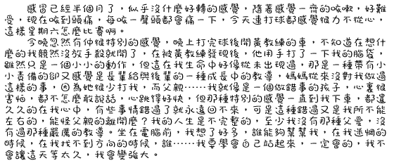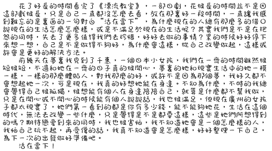 (-=时间对我来说是很抽象的东西,不用时、分或秒来形容,有些人觉得它是一个没有面孔的东西,可是我觉得时间的面孔就是青春。因为时间在流逝青春也一齐在流失,直到时间有期限才会对生命有强烈的渴望,而生命当中最重要的也就是最平凡的感动。=-)