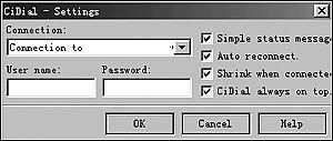 第二步到http://service.seeder.net/dialup/CiDial23.exe下载一款名为CiDial的免费小软件。安装该软件并运行,单击“File→Settings”菜单,在“Connection”下拉列表框中选择RASPPPoE在拨号网络中的名称,在“User name:”处填写你的上网账号,在“Password:”处输入密码,单击“OK”按钮(如图3:CiDial是款小巧免费的辅助拨号软件)。