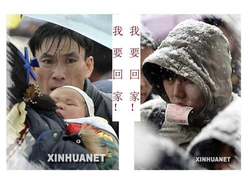 看到荧屏里,漫天飞雪,白色大地。国道上,排成长龙的近千辆滞留货车。火车站里,那些脸庞上写满『念家』的游子们,那些在父母怀里刚刚熟睡的孩子,褶皱的火车票。我除了沉默,还能做何语言。
