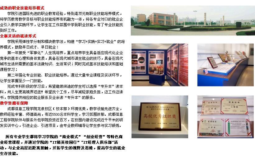 [成都信息工程学院简介] 成都信息工程学院始建于1951年,现有1个一级学科硕士学位授权点,另有6个二级学科硕士学位授权点;有38个本科专业,覆盖工、理、管、经、文、法等学科门类。学院现设有17个系,1个继续教育学院。学院现有在校本科生15621人(其中国防生498人),硕士生193人。 成都信息工程学院现有航空港、龙泉、人南