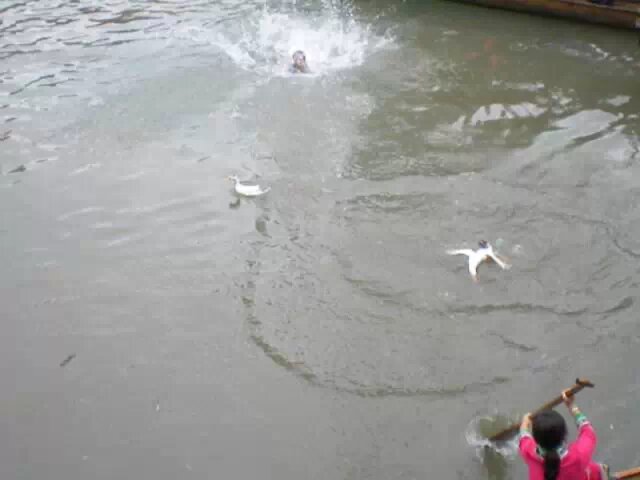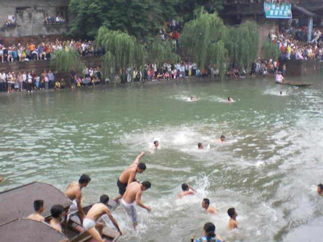 (抢鸭子)凤凰端午节的活动里最有意思的要数抢鸭子了,赛龙舟比赛结束时,主办方会从虹桥、吊脚楼、船上扔出很多鸭子,凤凰的传统是抢到的鸭子归自己,晚上的美味鸭子大餐就有了。一时人声鼎沸,参赛者从各处将船划到比赛地,跳下水抢鸭子,两岸的不少游客也纷纷和衣跳入河中,各显本领捞鸭:或饿虎扑食,或出其不意,良久,从河面上冒出一个湿淋淋的脑袋,手里拽着一只活蹦乱跳的鸭子。每到这时,岸上的人或狂呼乱叫,或手舞足蹈,或捶胸顿足……原来最高潮的节目现在才上演,不用10分钟,鸭子全被捉了回去加菜了,又不到10分钟人潮已散开不见了,古城内又马上回复宁静,沱江偶然才会有一叶小舟飘过。沈从文先生《边城》笔下的翠翠,就是在端午节赛龙舟与水中抢鸭子时,无意邂逅了勇敢英俊的心上人摊送。