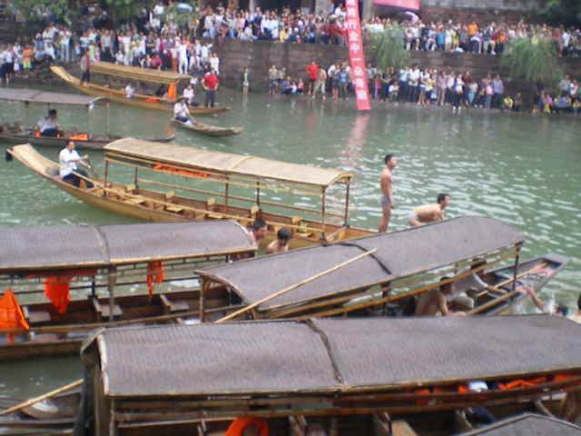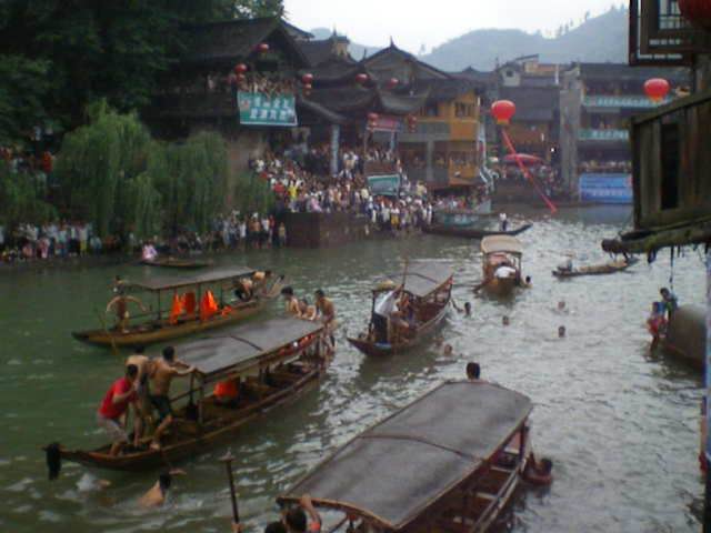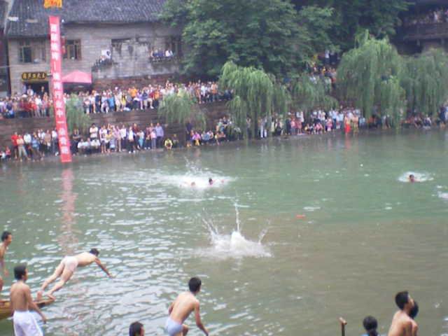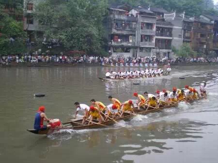 总觉得凤凰可以没有了跳岩,可以没有了夺翠楼,但决不能在端午的时候不赛龙舟,不抢鸭子。如果没有赛龙舟,翠翠不会遇见傩送,也就没有了边城。没有了写出边城的沈从文,凤凰也许就如今日的镇远一样。听说很美,但见过的人很少。所以,为了多少去寻找边城的人,凤凰的龙舟是一定要比的。每年的端午节凤凰古城都会举行龙舟竞渡,一般前后三天,是一年里凤凰人最隆重和最热闹的事情。比赛当天每个苗家寨子都会派出最精壮的汉子参加竞渡,河里游弋着几条龙舟,称之为红龙、黄龙、白龙和乌龙。每条船上,坐着20名桡手。那桡手清一色光头、光膀子,都只穿着或蓝或青的短裤。站在水边、桥上、吊脚楼的人兴致勃勃地为参赛者呐喊助威,好像恨不得自己也能跳到船上去一展身手。