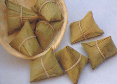 (端午食粽)端午节吃粽子,这是中国人民的又一传统习俗。粽子,又叫“角黍”、“筒粽”。其由来已久,花样繁多。据记载,早在春秋时期,用菰叶(茭白叶)包黍米成牛角状,称“角黍”;用竹筒装米密封烤熟,称“筒粽”。东汉末年,以草木灰水浸泡黍米,因水中含碱,用菰叶包黍米成四角形,煮熟,成为广东碱水粽。晋代,粽子被正式定为端午节食品。这时,包粽子的原料除糯米外,还添加中药益智仁,煮熟的粽子称“益智粽”。时人周处《岳阳风土记》记载:“俗以菰叶裹黍米,……煮之,合烂熟,于五月五日至夏至啖之,一名粽,一名黍。”南北朝时期,出现杂粽。米中掺杂禽兽肉、板栗、红枣、赤豆等,品种增多。粽子还用作交往的礼品。其中以浙江嘉兴粽子为代表。吃粽子的风俗,千百年来,在中国盛行不衰,而且流传到朝鲜、日本及东南亚诸国。