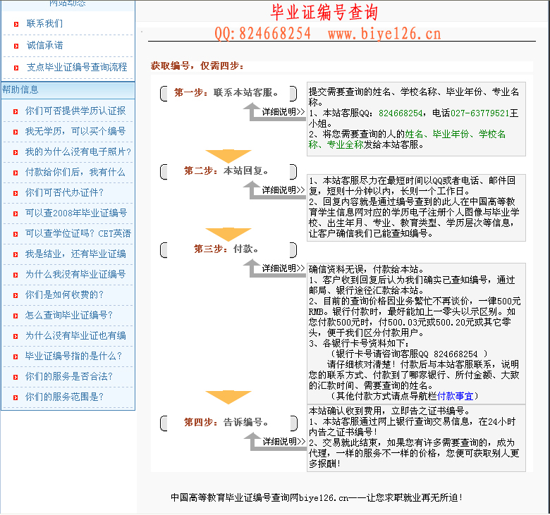 我站能够在短时间内准确地查询出正确编号,为广大毕业生着想,特别推出编号查询的收费服务!望有心之士多多留意没有拿到毕业证的毕业生,告诉他们这个好消息!