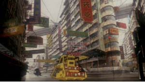 渡船缓缓地行驶在狭窄的航道,好似一滴水滑进海洋。街景是押井守喜欢的香港,高楼和矮巷交错,繁华和颓败齐放,灰暗的建筑物之间有璀璨明亮的霓虹灯和色彩鲜艳的招牌,人们衣着光鲜表情漠然,只有那条大耳朵的猎狗趴在天桥的栏杆上摇着尾巴,寂寞而友好。城市如此混杂且和谐,高级时装的专卖店、河水里漂浮的垃圾、半空中徐徐掠过的飞机投下的巨大阴影……毫不相干的元素组合成奇异的拼图,深深烙印在过客们的眼眸。