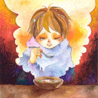 一个人吃饭简单方便,一副碗筷、几元钱就敷衍了一餐,有时懒怠跑路,泡包方便面或者一杯牛奶几片饼干也凑和。吃饭渐渐沦为纯粹的补充能量,象电池充电或者汽车加油。三口两口解决战斗,蛋白质、淀粉、纤维、碳水化合物匆匆从口腔滑进胃袋,经过各种液体参与发生化学反应变成热量支持着身体这部机器运转下去。这样的饭包含的感情值降到了最低点,毕竟不是所有人都象某些偏执的美食爱好者一样,可以从一道菜里品尝出一次回肠荡气的人生之旅的。