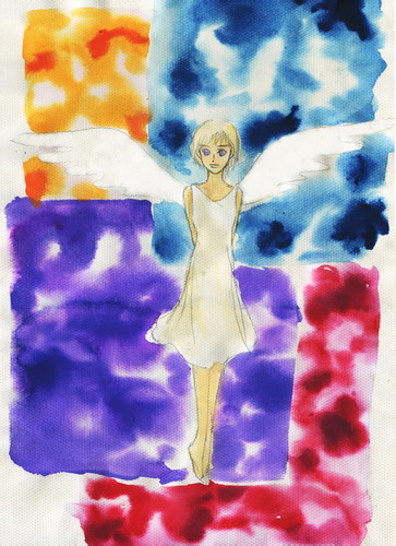 看完了就有了灵感,那双翅膀简洁而舒展,很有天空翱翔的感觉。于是听着改编自宗教音乐的插曲《the garden of everthing》,三个小时内画了这幅《Angle》。