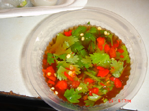 这是蘸料,让人垂涎欲滴的辣汁,小香菜不停晃动。我喜欢吃的时候全部浇淋在卷粉上。