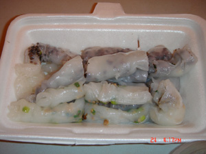 越南小卷粉,里面夹杂香菇和小韭菜,透亮的皮子,用剪刀剪成一段段。